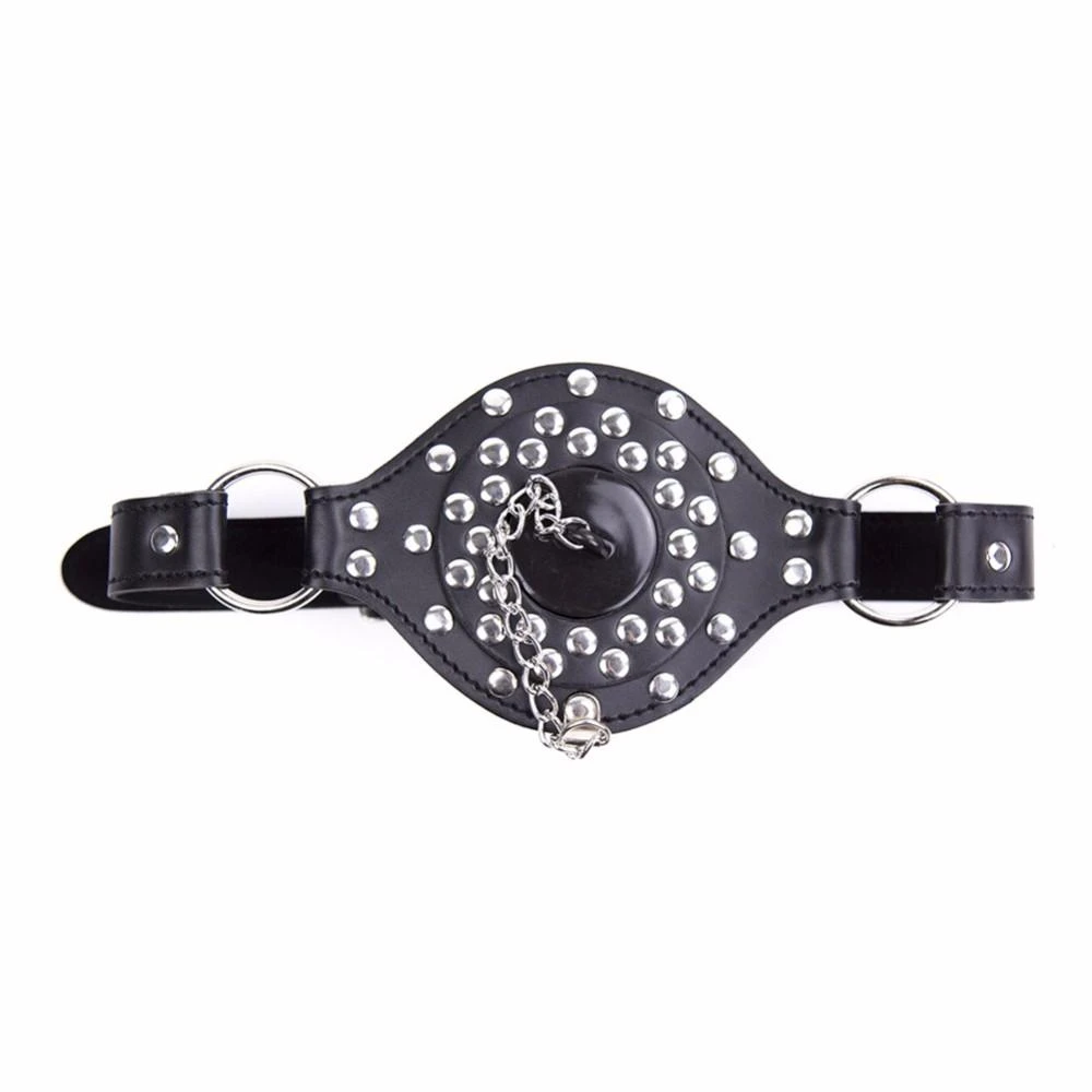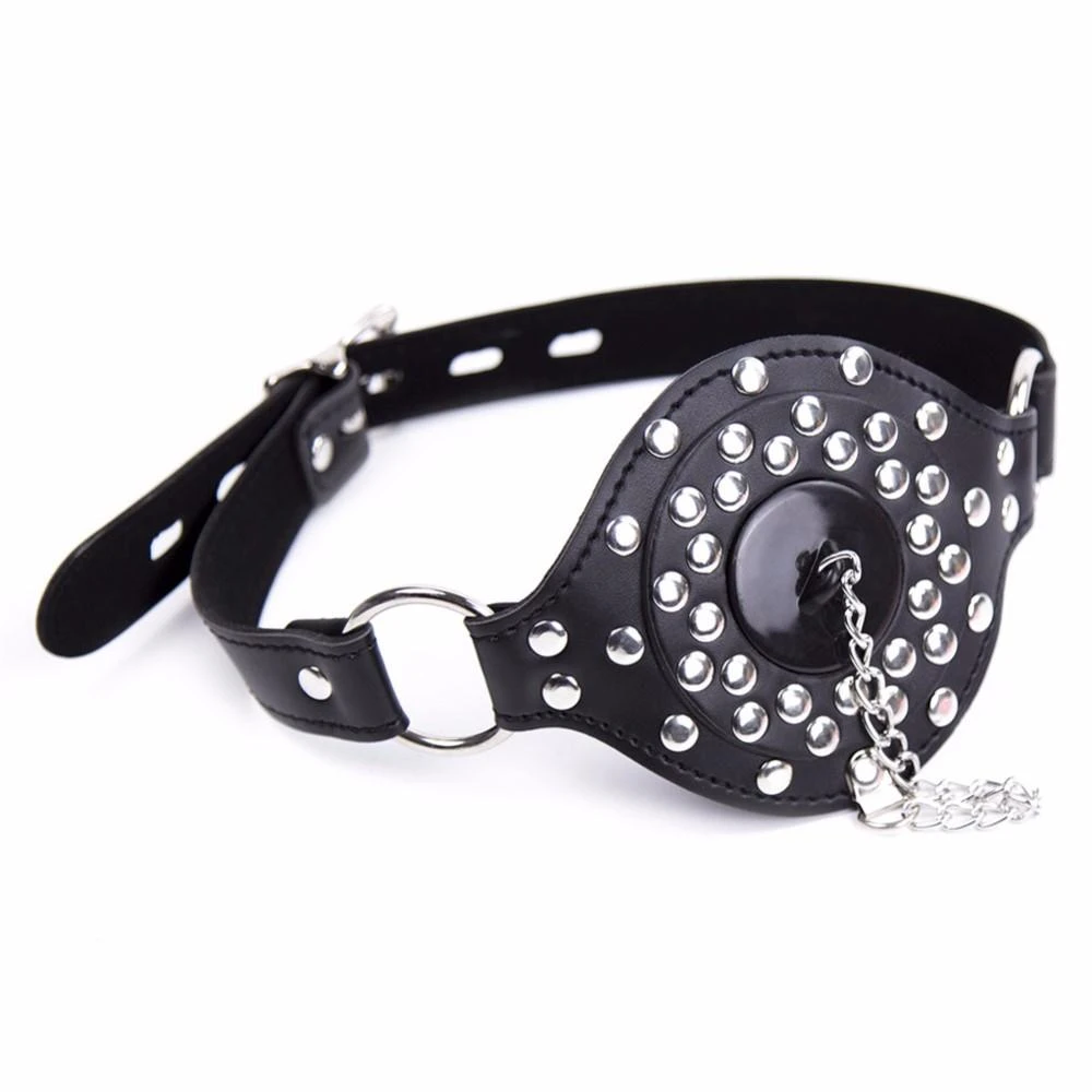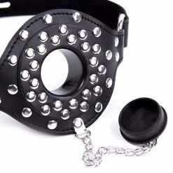 Plug up your submissive’s mouth with this leather studded stoppable gag! The versatile feeding gag allows you to insert the plug so you can control when you want to hear the muffles and moans of your subject! Once you’re ready, your partner’s lips will be spread and their mouth wide open waiting for you. Perfect for bondage enthusiasts looking to spice things up, this tunnel gag extends slightly into your partner’s mouth keeping their teeth and tongue out of the way so you can experiment with feeding fantasies! This unique bondage accessory is designed with an adjustable leather strap to fit most.