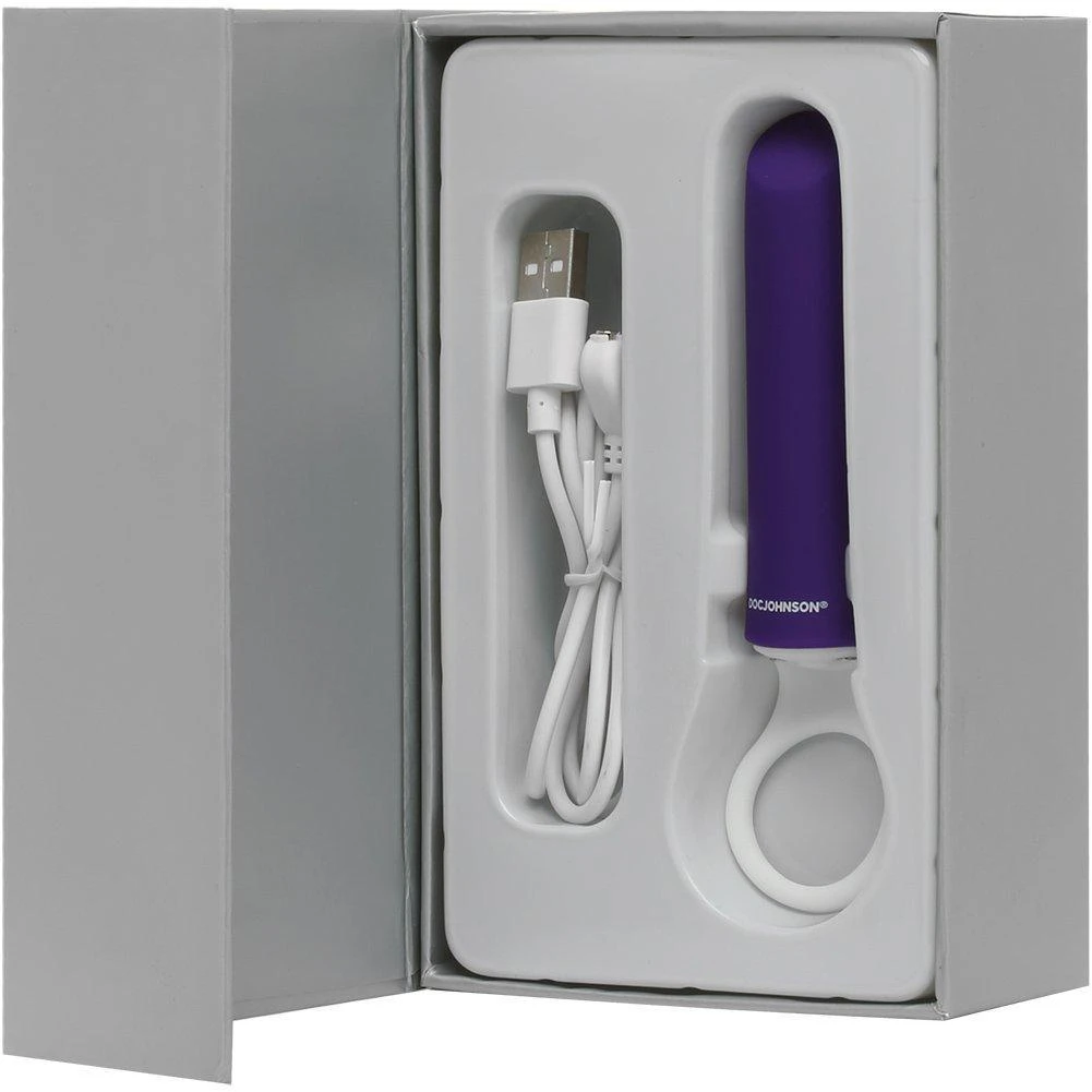 – Package includes: Silicone bullet and USB charging cable in plastic case within a metallic slip box.