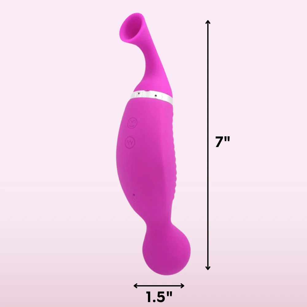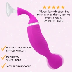 - “What’s so special about that?” This dual-action clit-sucking toy is a truly unique and versatile pleasure tool! The combination of erotic sucking sensations from the clitoral pump and the ultra-strong vibrations from the wand massager makes it easy to achieve an intense orgasm or even multiple orgasms! With separate controls for the vibrating and sucking settings, you can build your orgasm by using the suction first, the vibration first, or both at the same time! We love that the mouth of the clit sucker is very flexible and fits all body shapes. The textured handle of this unique vibrator with clit suction provides a secure grip and is ergonomically curved to make it comfortable to hold no matter which end you’re using! This multi-function clit-sucking toy is great for anyone who loves powerful body wand vibrations and stronger clitoral orgasms!